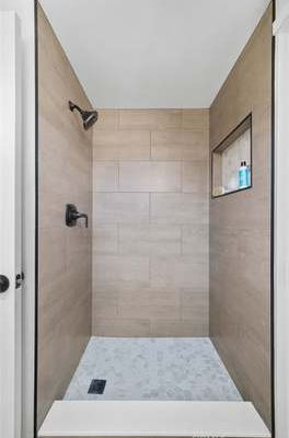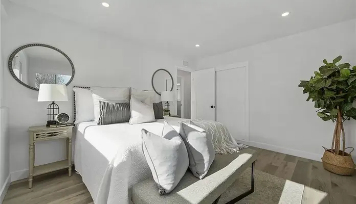 Complete interior and exterior transformation with crisp white stucco, gray cabinet finishes, and modern bathroom updates.